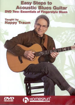 Here in lesson II of Happy Traum's Easy Steps to Acoustic Blues Guitar (@1:32min) Happy clues us immediately that this guitar lesson continuation will begin to require more work than disc one. Because we'll try to do two or more things at once with the different fingers of your strumming/picking/plucking/palm muting hand.